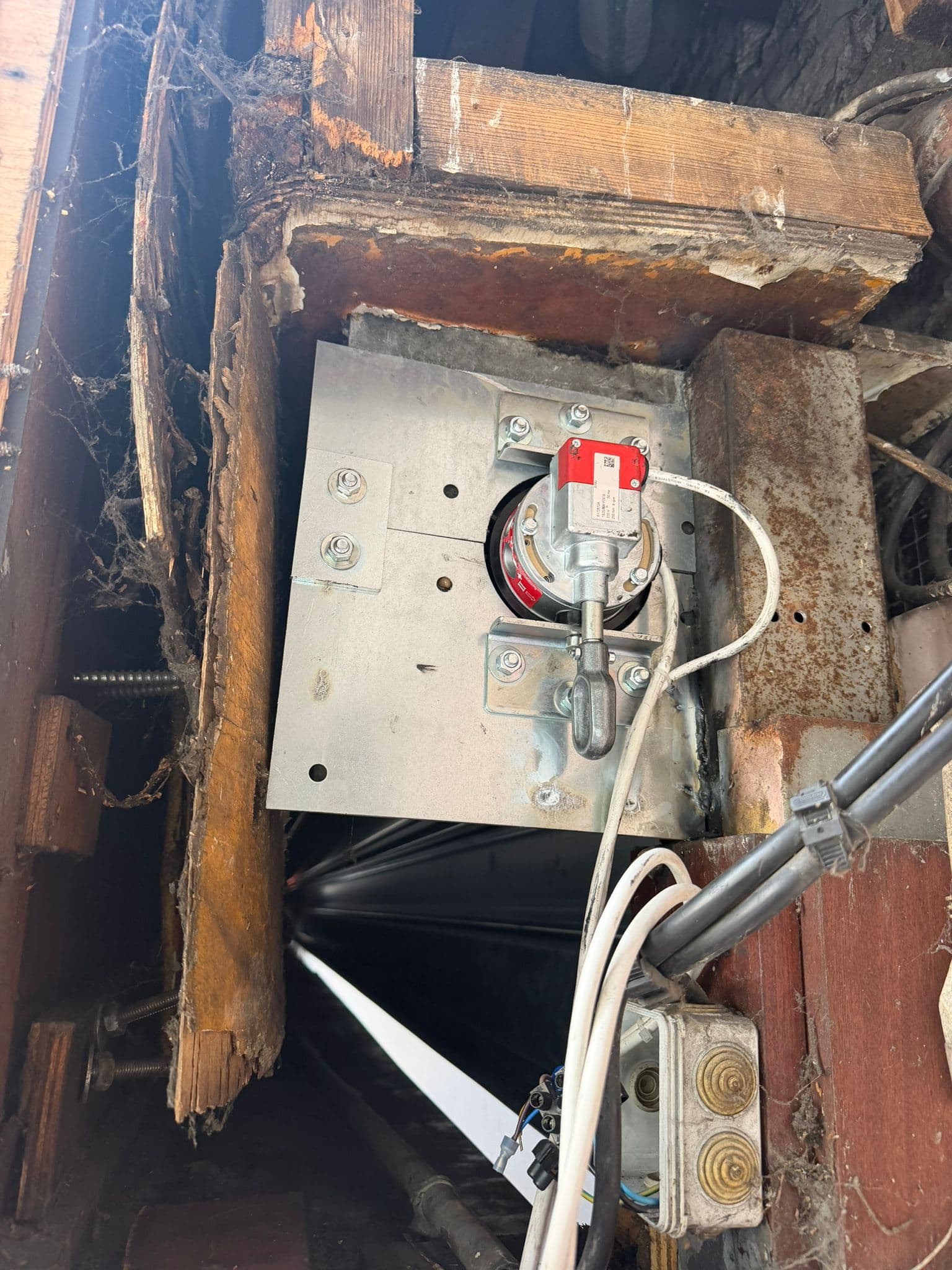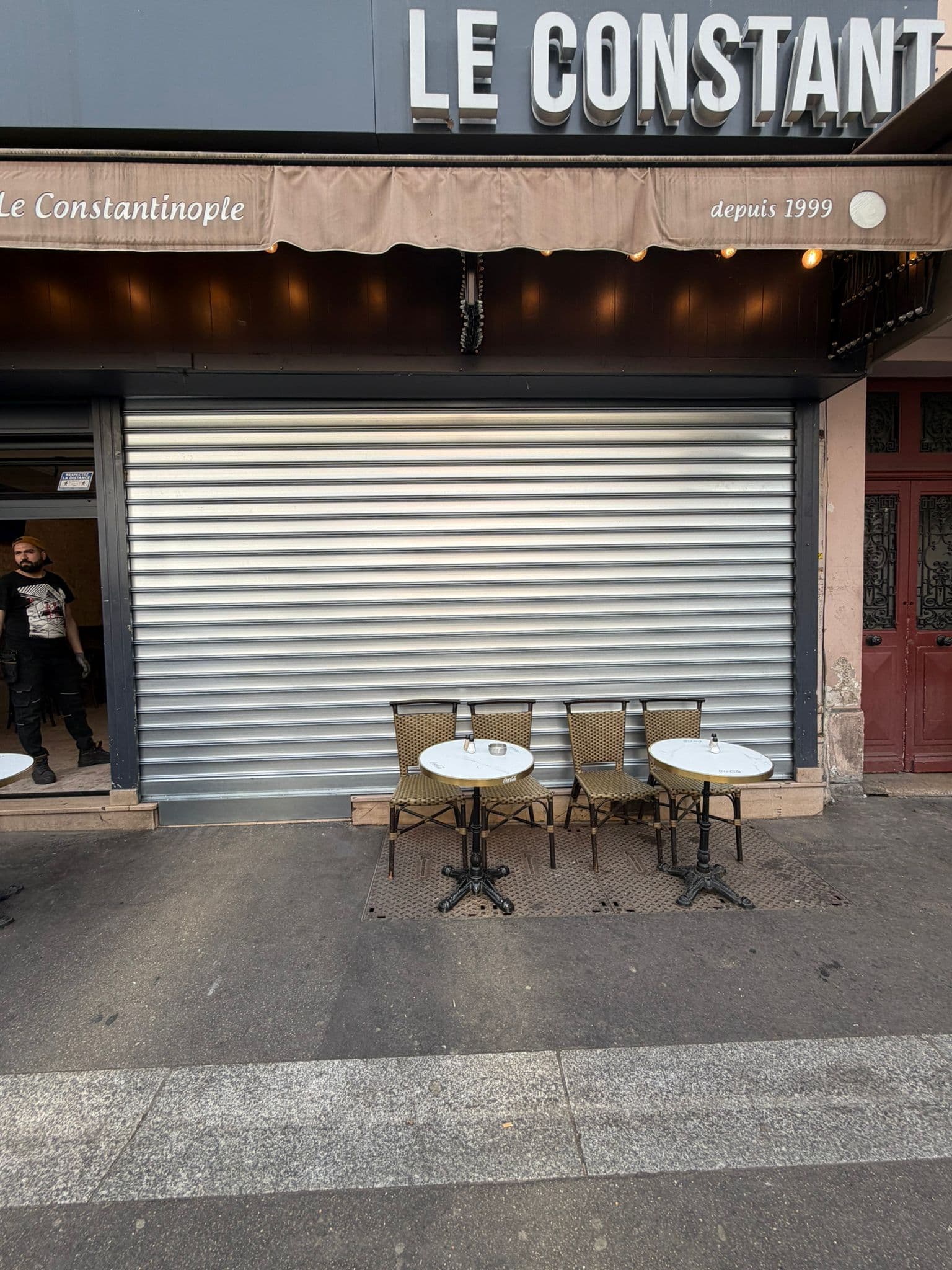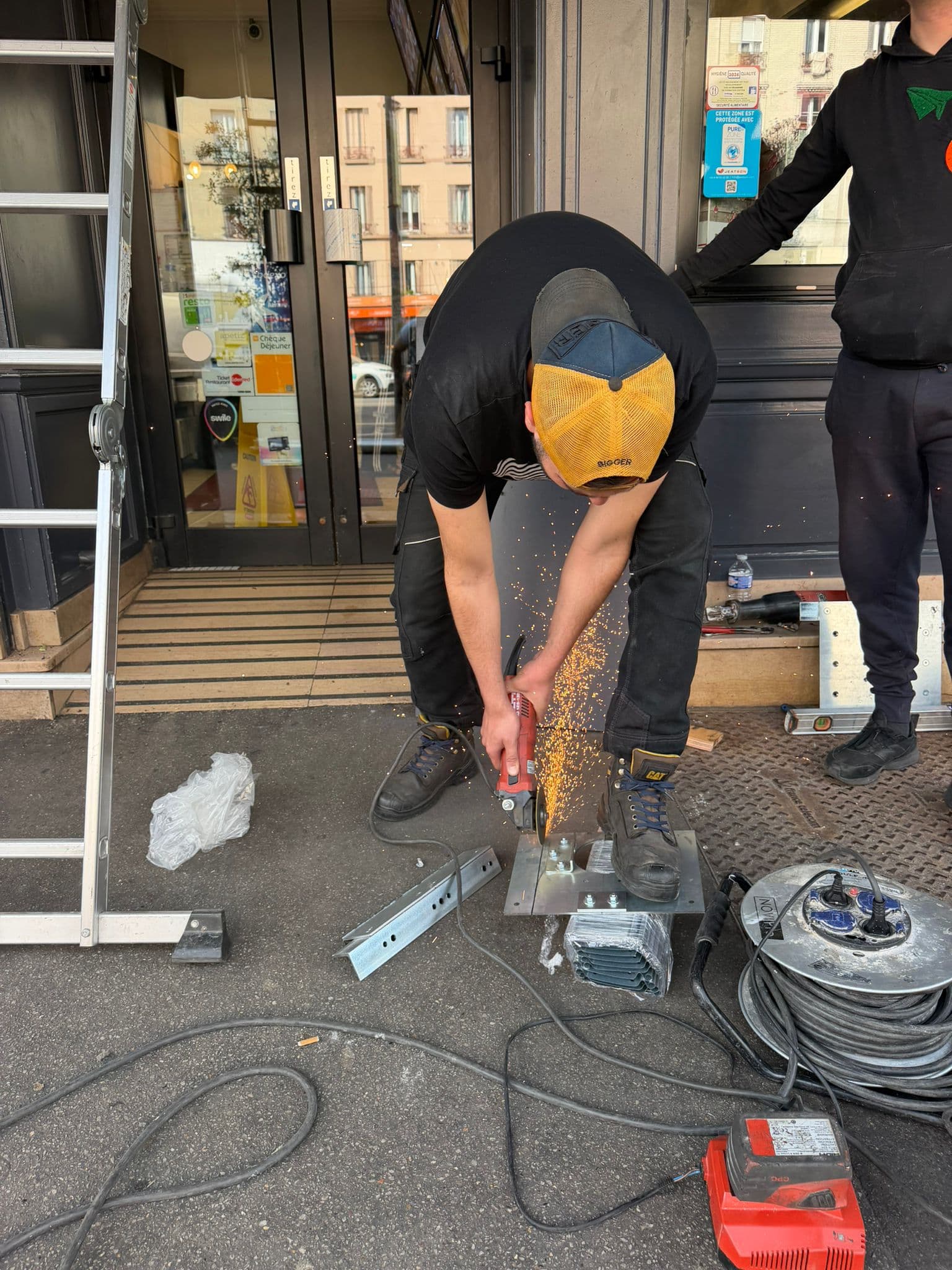 Réparation complète d'un rideau métallique commercial avec remplacement de l'axe tubulaire et du tablier pour retrouver une fermeture fluide, silencieuse et sécurisée.
